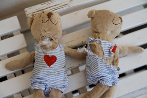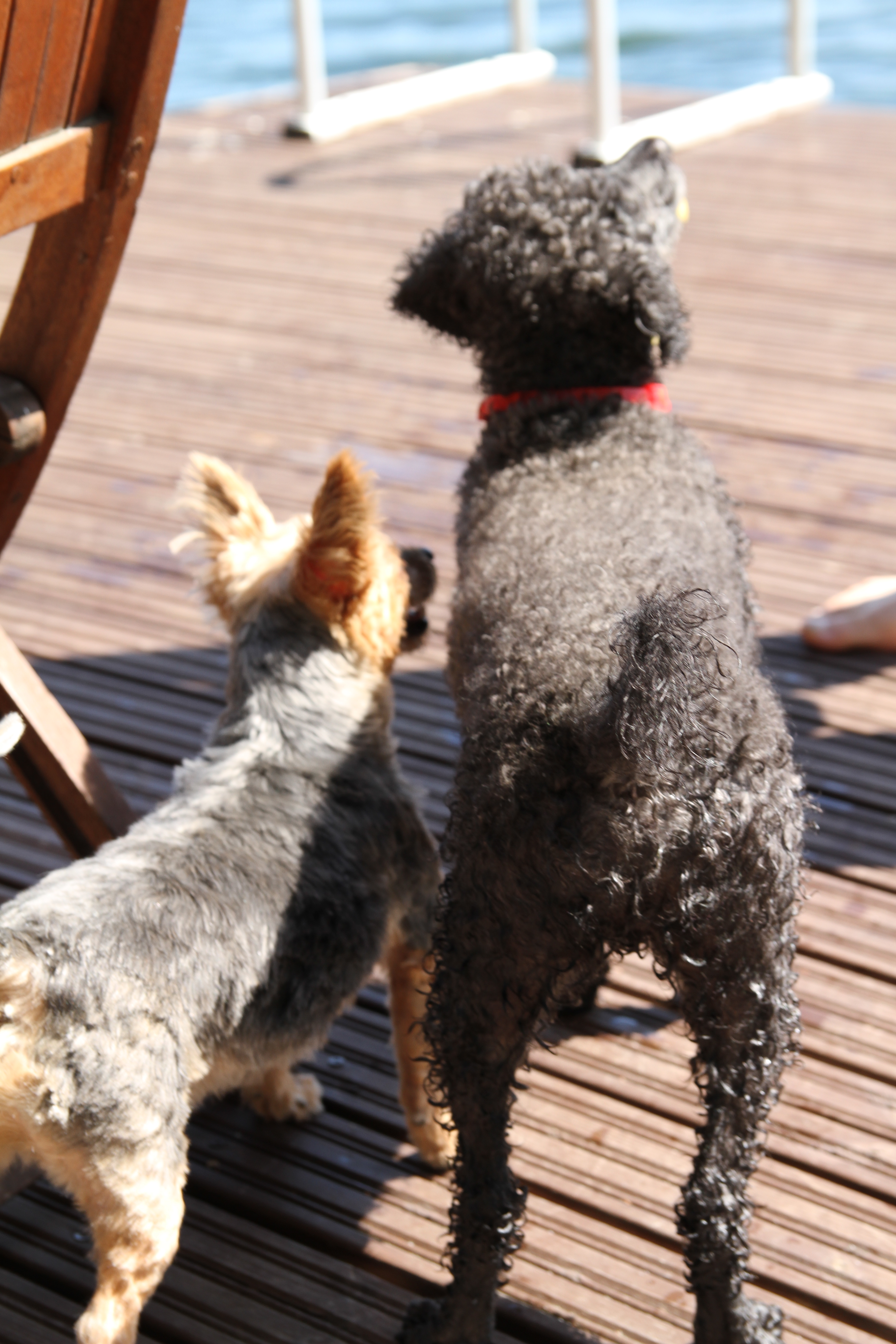 MY FURRY BEST FRIENDS ON THE DOCK AND THEIR CUDDLY TOYS, WHICH ARE IN REALLY SAD CONDITION AFTER ALL THAT PLAYING 24/7…