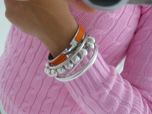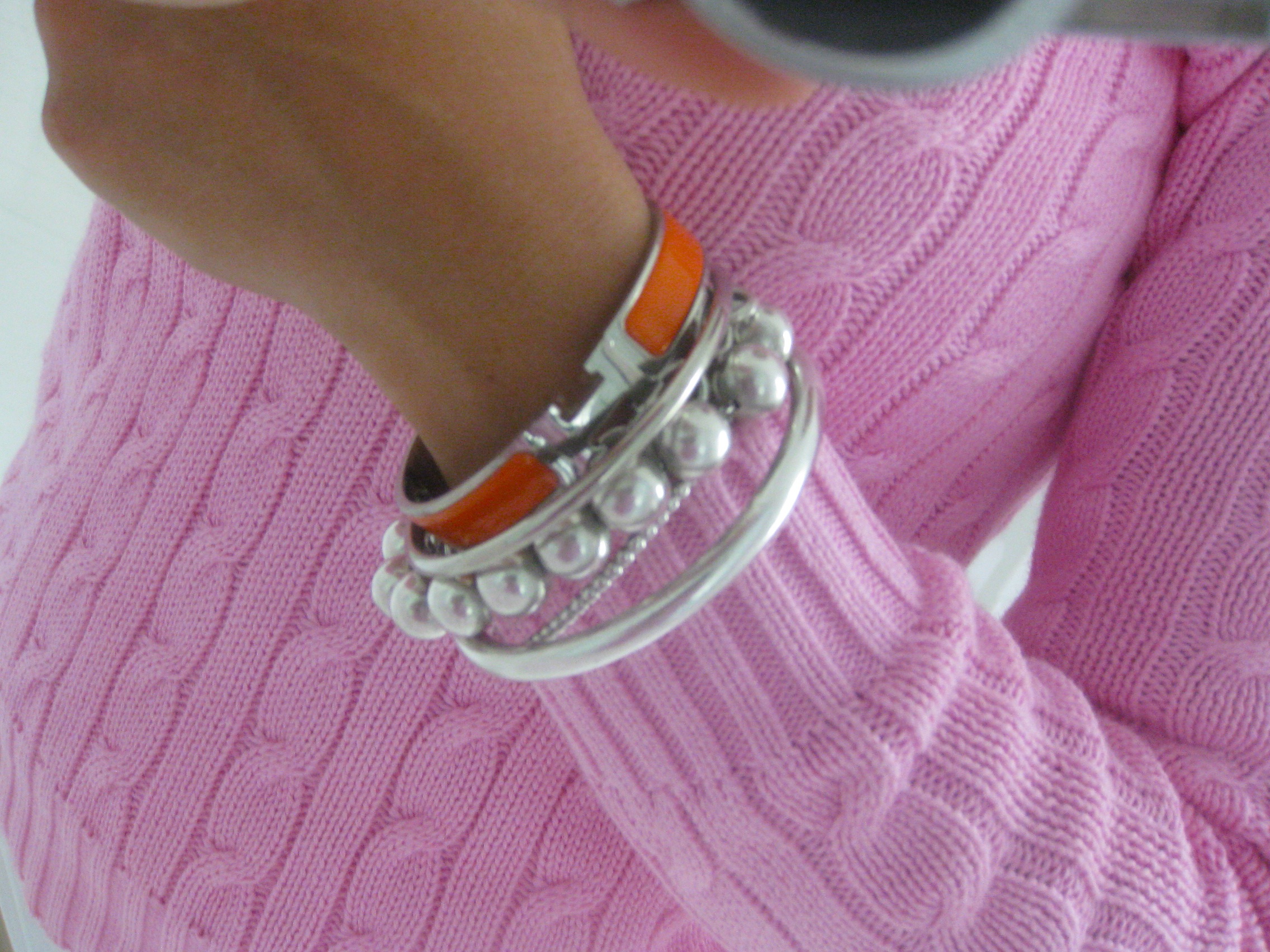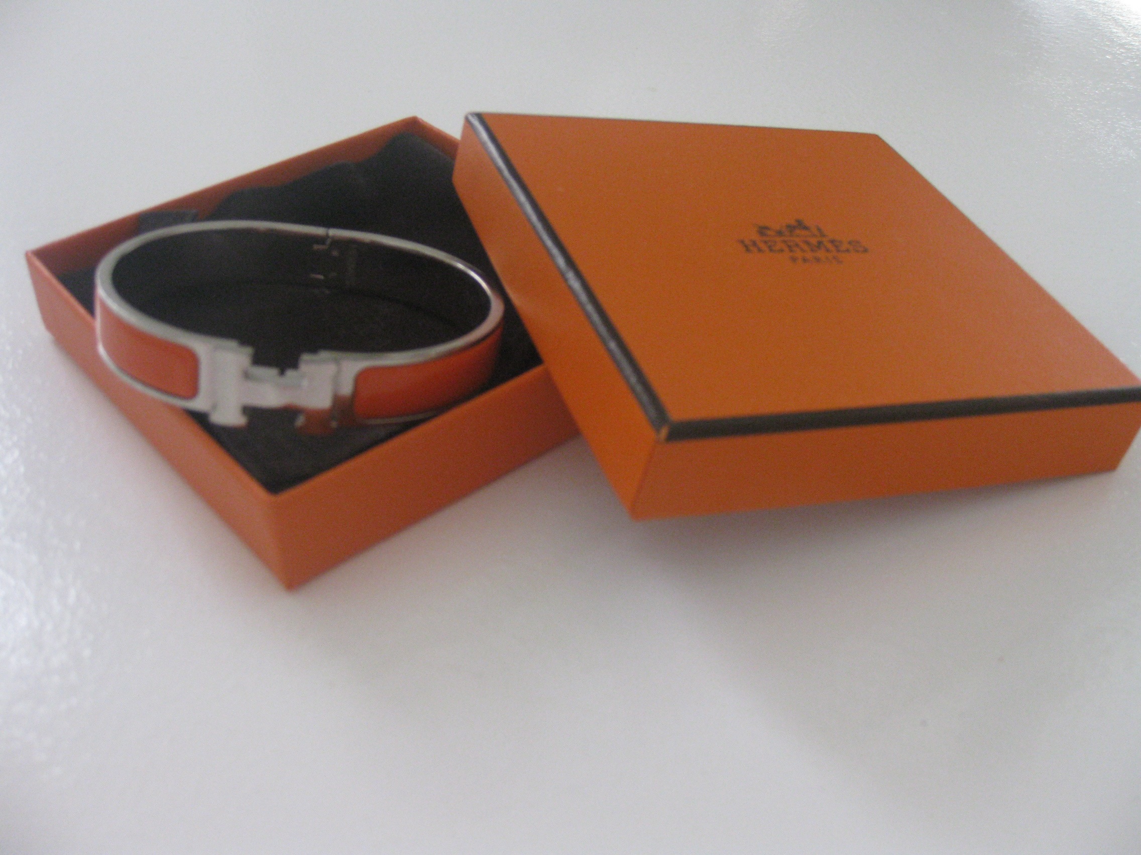 THIS IS MY TREASURE, I GOT THIS HERMES BRACELET FROM MY LOVE COUPLE YEARS AGO IN PARIS FOR MY BIRTHDAY. IT´S CLASSIC PIECE, AND THE COLOUR IS OF COURSE ORIGINAL HERMES ORANGE. THAT COLOR IS GREAT SINCE IT MATCHES WITH ANY OTHER COLOUR. ( IT´S CALLED CLICK H NARROW ENAMEL BRACELET, SILVER AND PALLADIUM PLATED, 6 CM DIAMETER ).