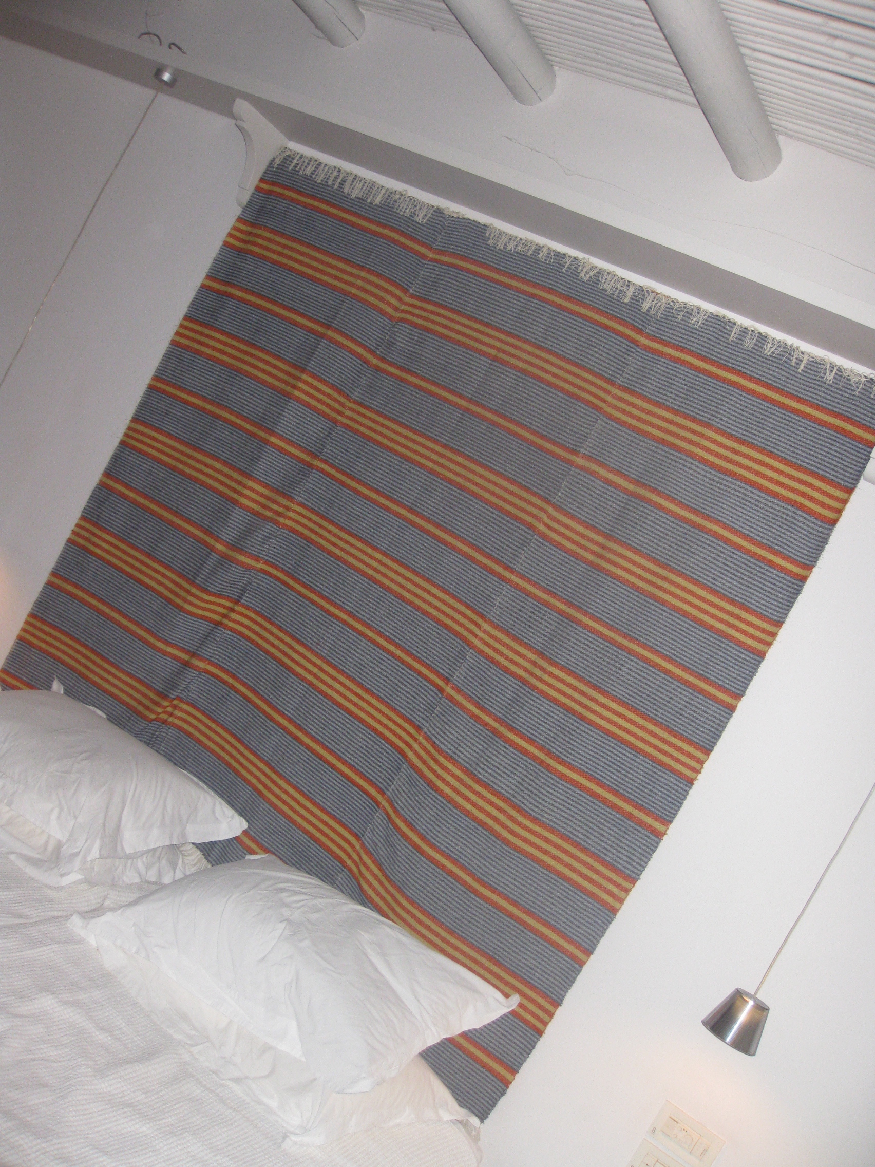 THE CEILING WAS SUPER-COOL AND THE ONLY COLOURFUL DETAIL IN OUR ROOM WAS THIS FRESH BLUE-ORANGE STRIPED COTTON RUG…