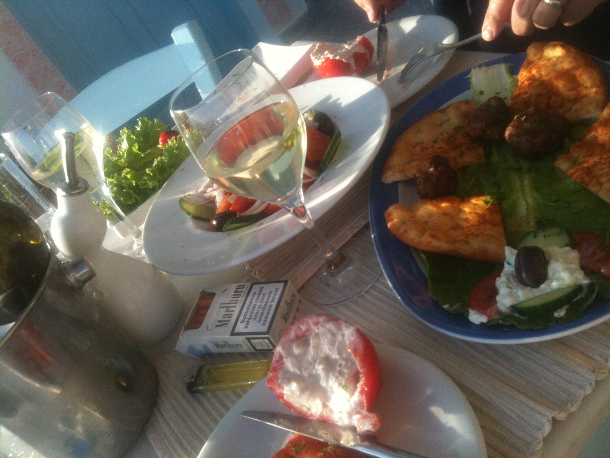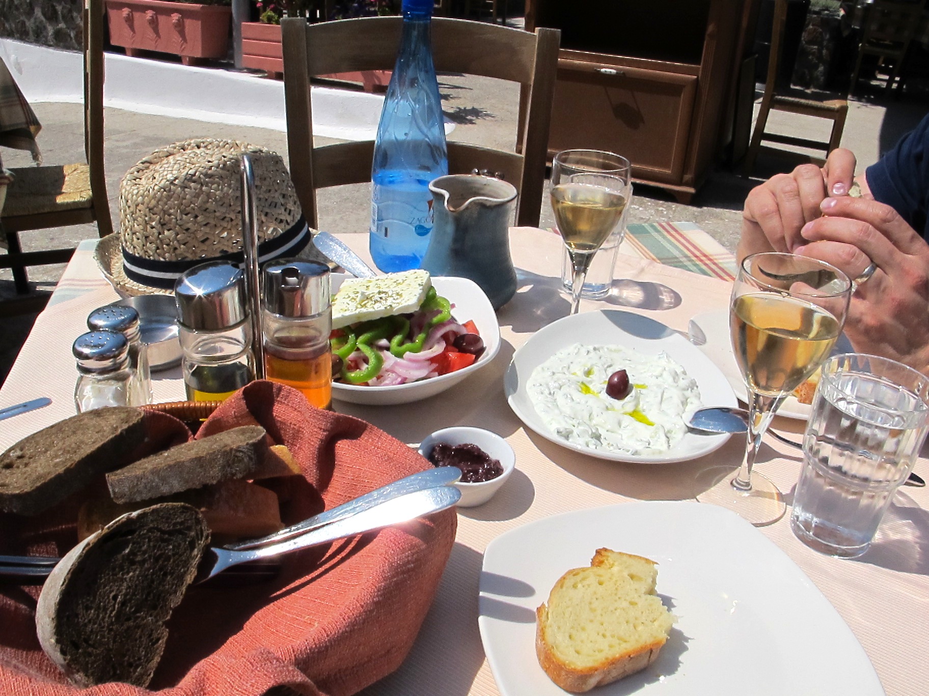 GREEK LUNCH; FETA SALAD, TZATZIKI, MOUSAKA AND WHITE WINE FROM A LOCAL WINERY….YAMMY