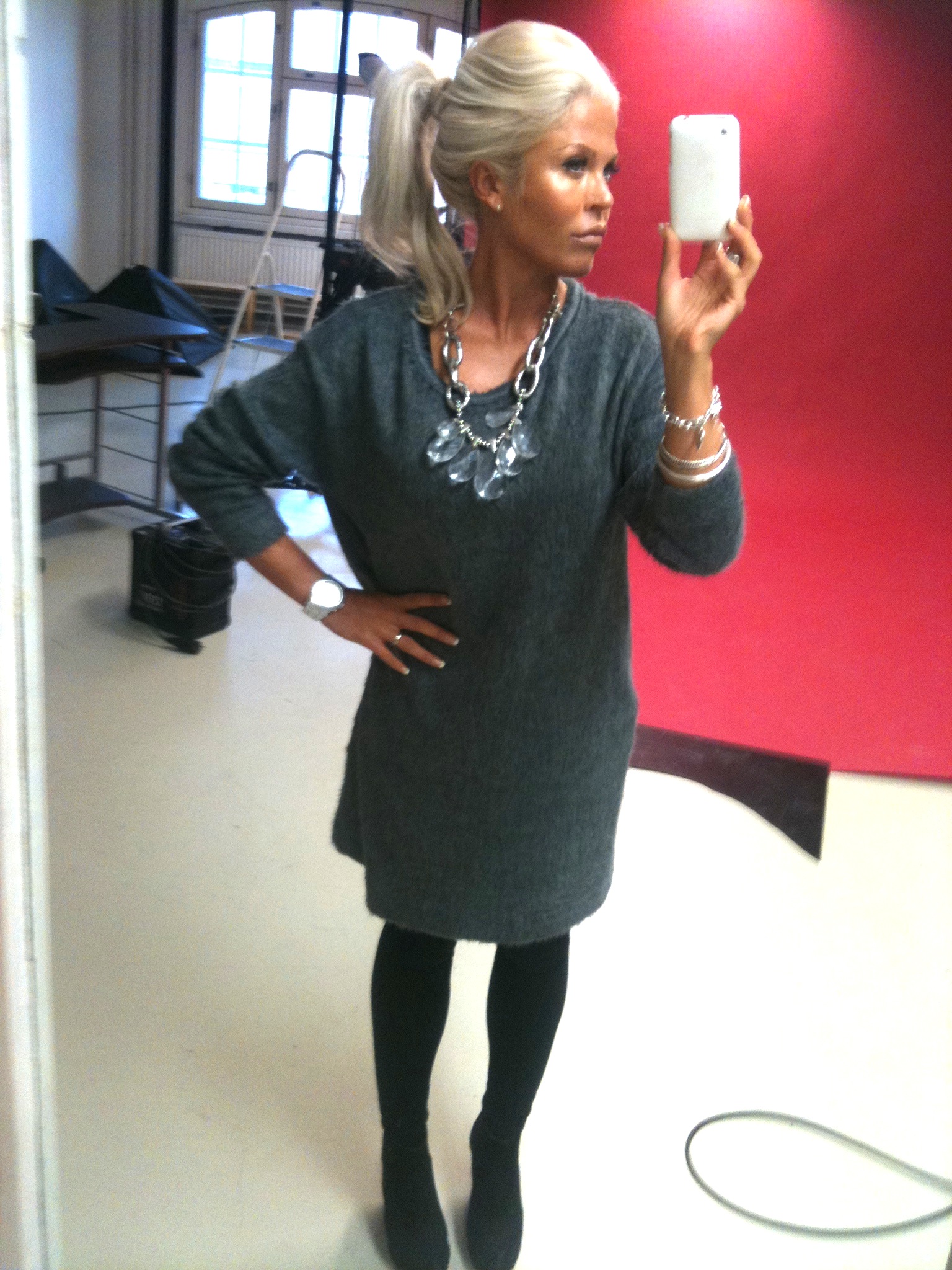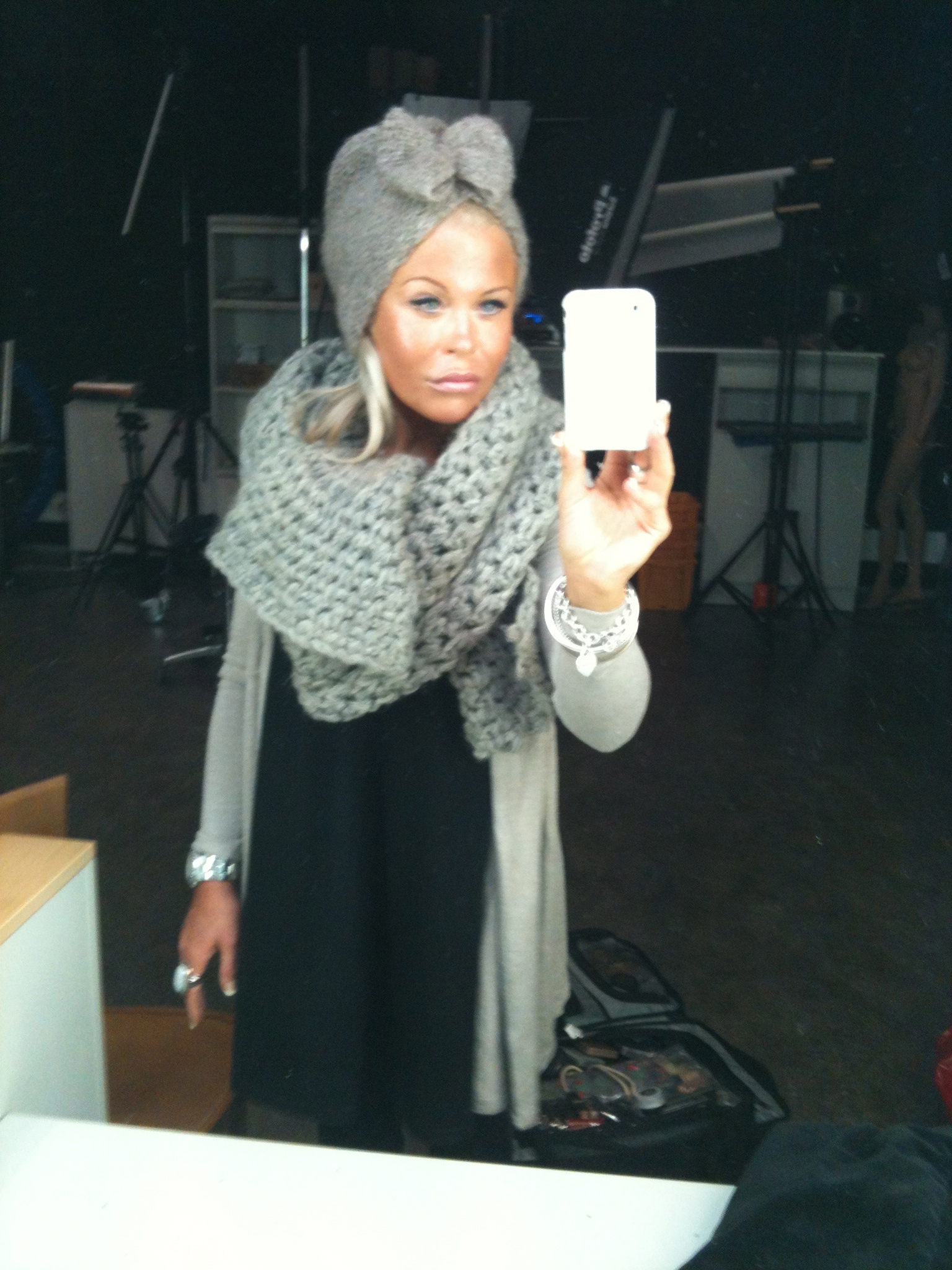 MY WORKING OUTFIT : TURBAN BEANIE/ ÅHLENS , DIAMOND BROOCH/VINTAGE, BUNNY DRESS/LITTLE BOUTIQUE SPAIN, SWEATER / GINA TRICOT AND DIAMOND RING/H&M.