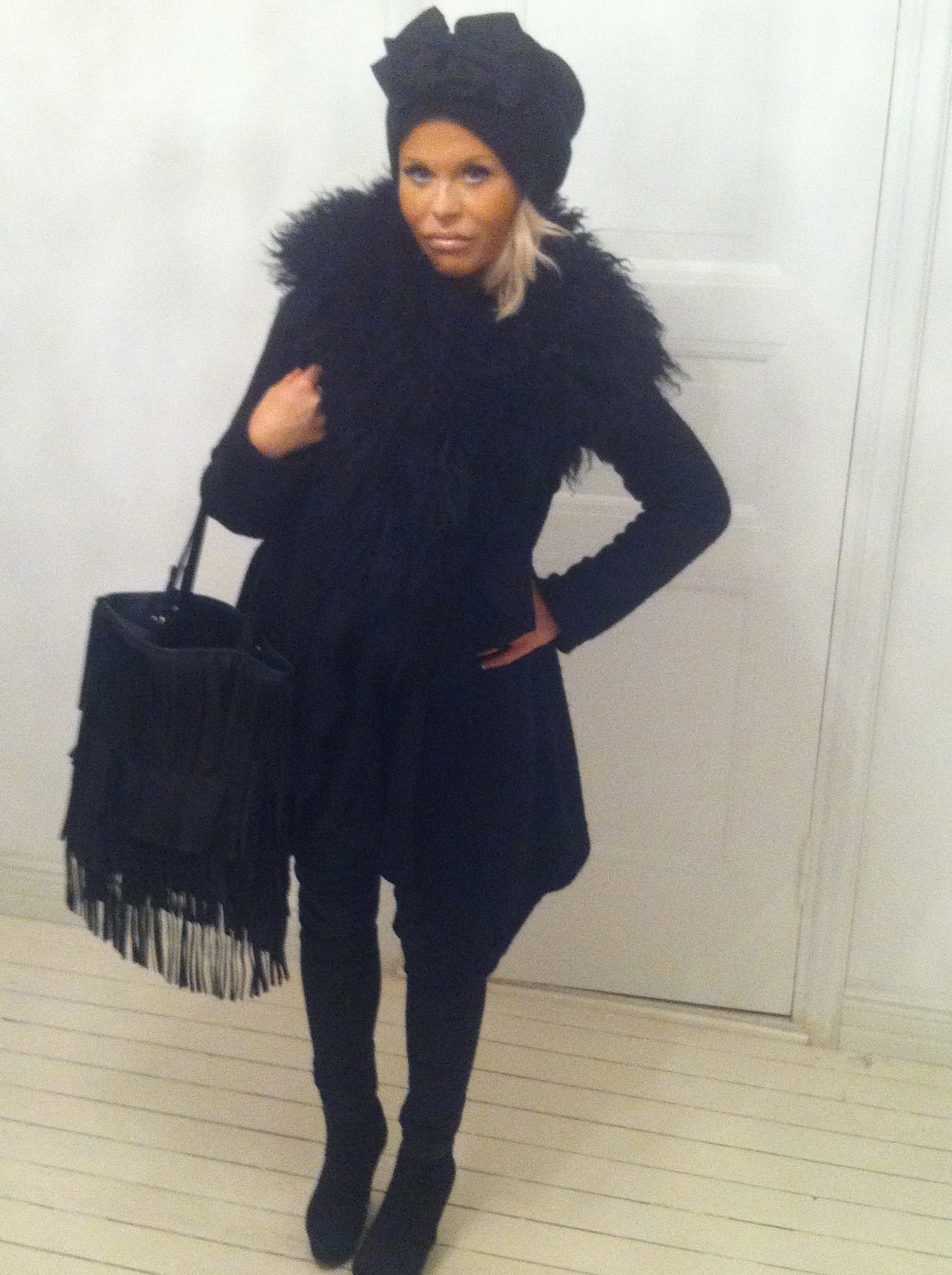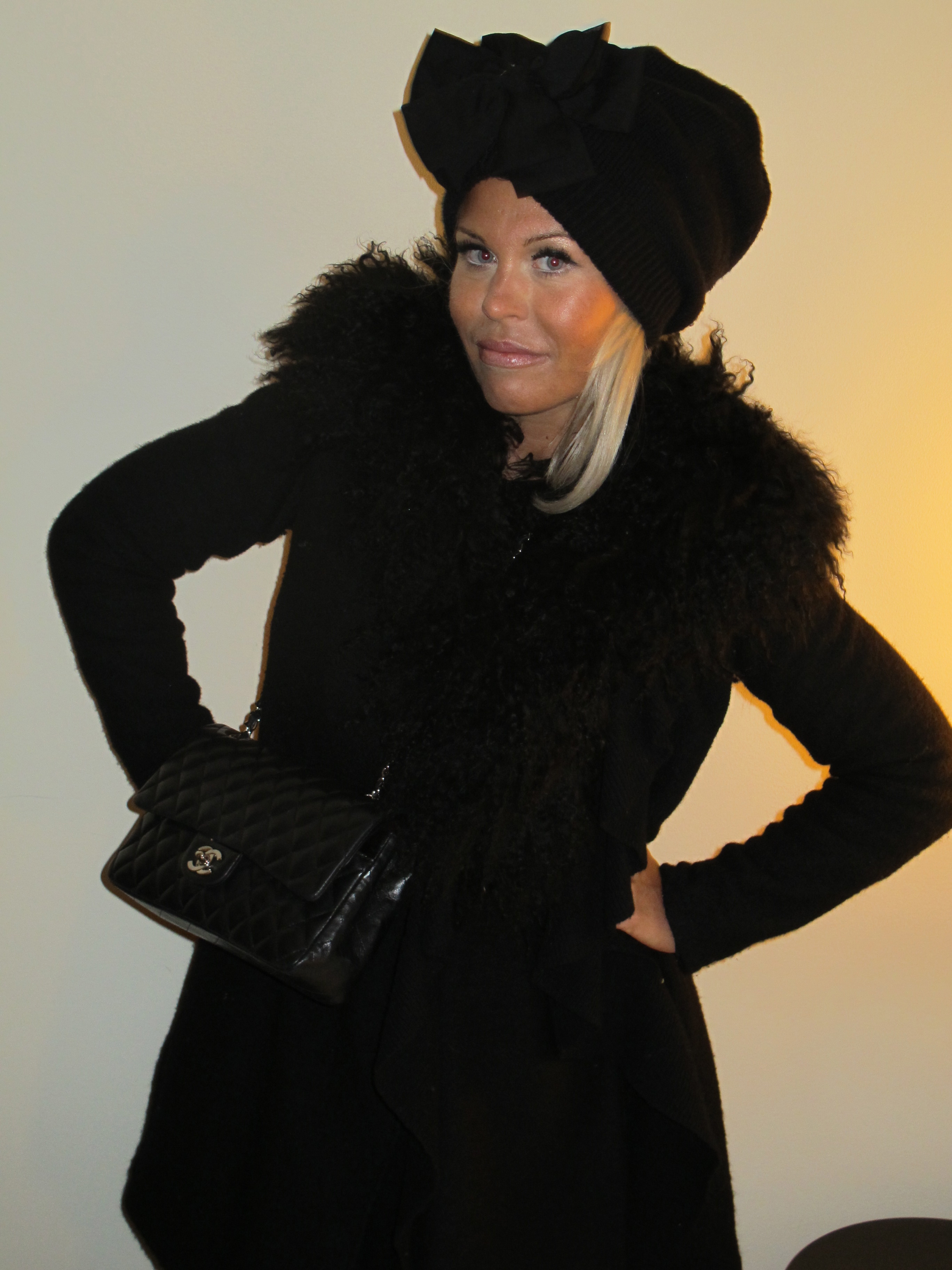 READY TO STOCKHOLM SHOPPING OUTFIT ; BEANIE THAT I PIMPED WITH A BOW , BOTH FROM HERE, JACKET, FRINGE BAG AND FUR COLLAR FROM HERE.