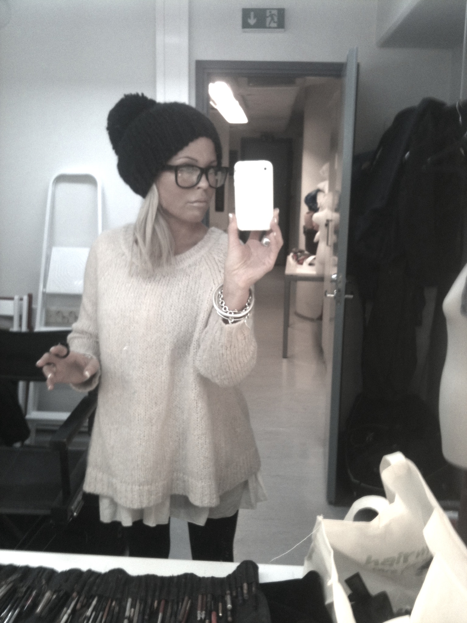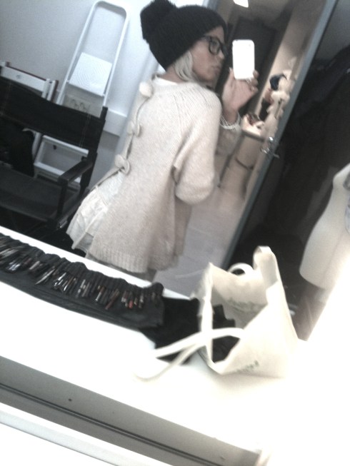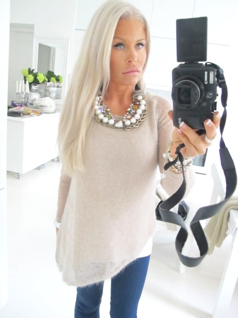 TODAY´S WORKING OUTFIT : NUDE BEIGE MAXI SWEATER WITH OPEN BACK AND LITTLE BOW DETAILS, COTTON SHIRT WITH FRILL TAIL, GLOSSY BLACK EYEGLASSES AND BLACK ´DIAMOND´ RING, ALL FROM HERE.