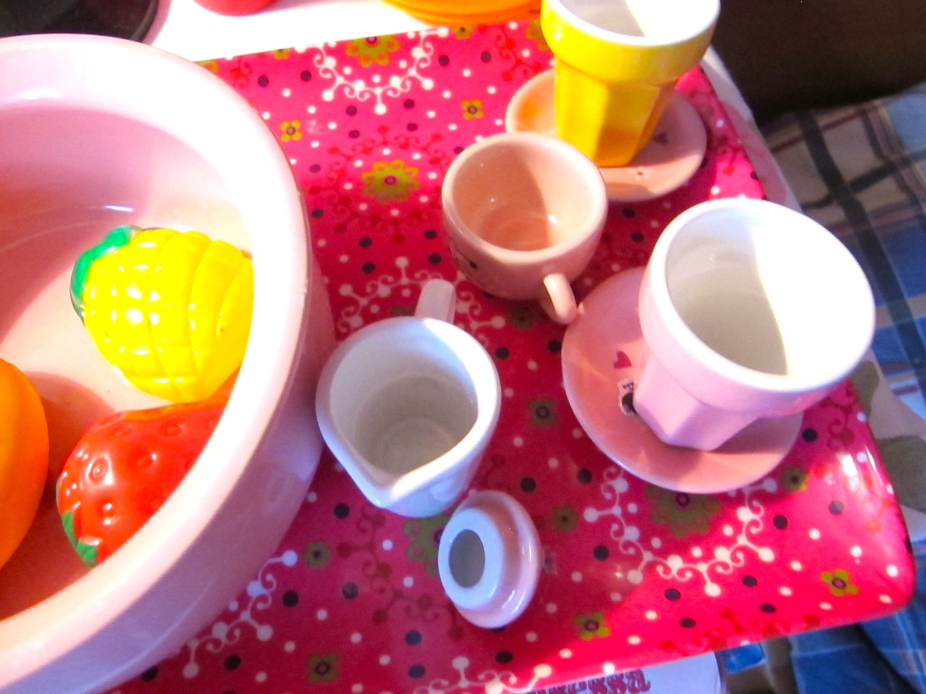CUP OF PINK TEA FROM PINK CUP AND SOME DELICIOUS PLASTIC FRUITS….